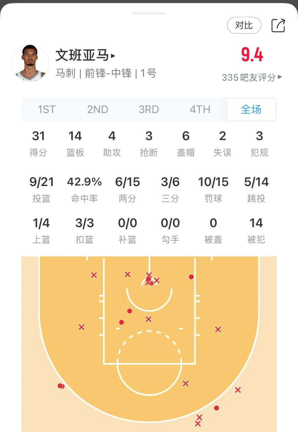 本场比赛文班亚马拿下31分14篮板4助攻3抢断6盖帽的超级全面数据,可以说再次统治了攻防两端,打的对手篮网队毫无脾气。