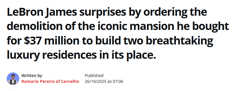 北京时间10月27日,据美媒CPG报道,詹姆斯的一个决定可能会令人感到意外,他将2020年以3700万美元购入的一栋豪宅拆除,计划启动一个更宏大的项目:在同一地块上建造两栋豪华住宅。