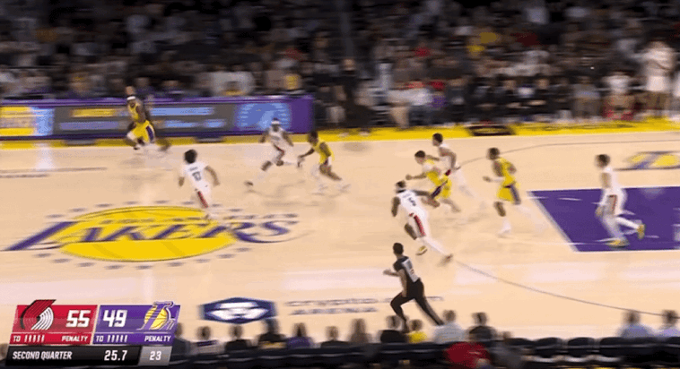 易边再战,卡马拉空切上篮,范德比尔特扣篮得手,夏普和克林根连续得分,里夫斯三分命中。艾顿漂移投篮,湖人将分差缩小到个位数,克林根补篮得手,开拓者打出一波8-0的进攻高潮还以颜色。里夫斯和格兰特对飙三分,克内克特连得6分,乐福空切上篮,格兰特三分命中。八村垒和史密斯连续得分,霍勒迪连得5分,开拓者带着12分领先优势进入第四节。