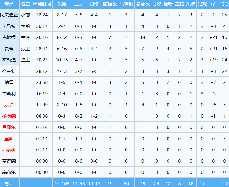 开拓者三人得分20+,阿夫迪亚25分4板4助,霍勒迪24分5板6助,格兰特22分3板3助3断,克林根16分14板(7前场板)两双到手