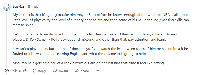 “我的直觉是,他可能还需要6个月才能充分适应NBA的身体对抗,然后他的传控技巧才能开始崭露头角。他在前几场比赛中扮演的角色和克林根相似,但他们是完全不同类型的球员。除此之外,他还需要学习,你会发现他有些时候完全不知道是自己犯规还是被犯规了,学习英语和理解裁判意图会很有帮助。另外,在我看来,他被吹了很多新秀哨,那些对他不利的哨声感觉就像是在欺负人。”这位球迷写道。