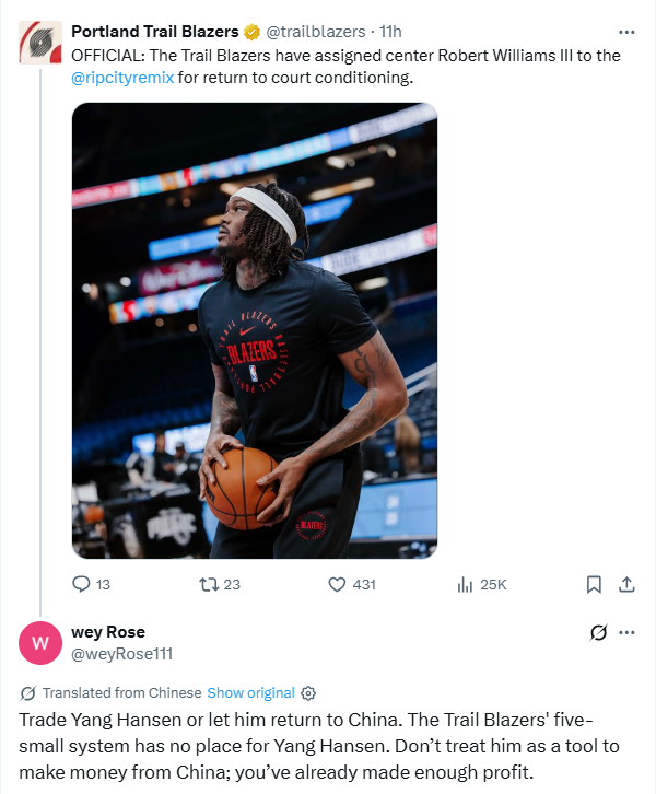 另一位球迷更狠,他说,“要么交易杨瀚森,要么让他回中国去。开拓者的五小体系里没有他的位置。别把他当成从中国赚钱的工具,你们已经赚不少了!”