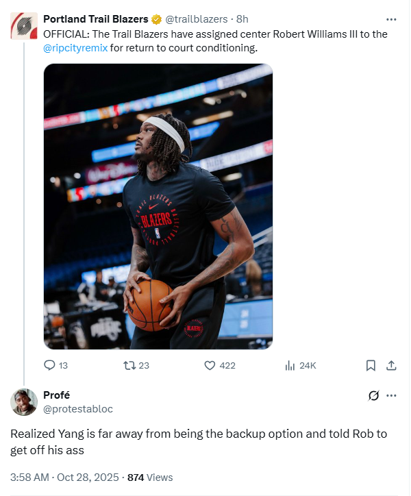 开拓者将中锋罗伯特-威廉姆斯送到了发展联盟,这预示着,罗威距离复出越来越近,他将与杨瀚森争夺替补中锋的位置。这个消息,瞬间引发了开拓者球迷热议,原本是罗威的新闻,美国那边的球迷跟我们一样,大家说的都是杨瀚森。
