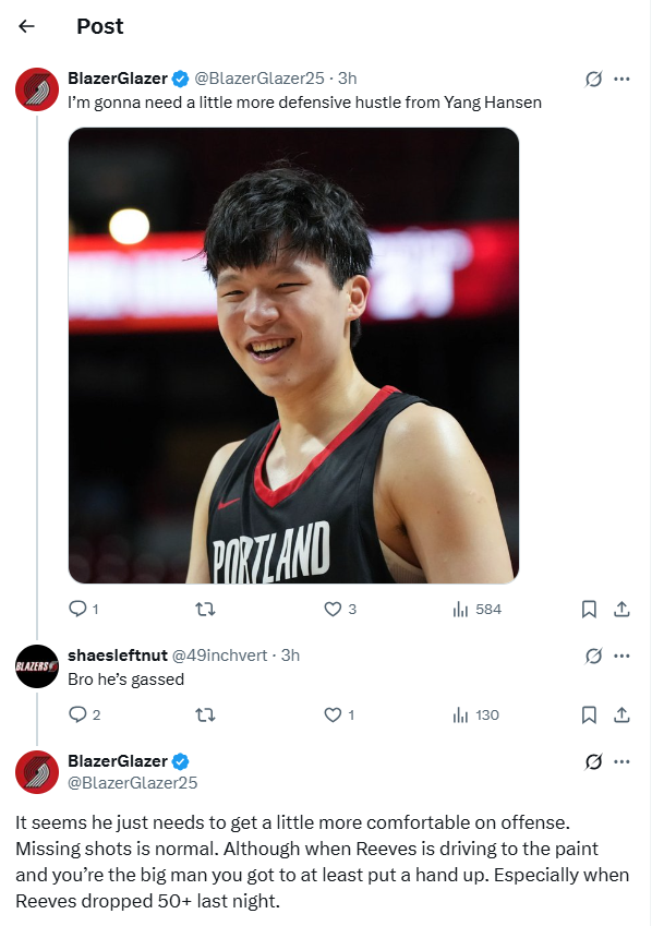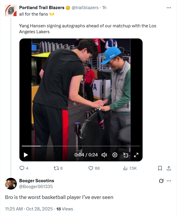 美国球迷是如何评价杨瀚森的?一位球迷在开拓者的推特上留言暴击:“这哥们,是我见过的最差篮球运动员!”