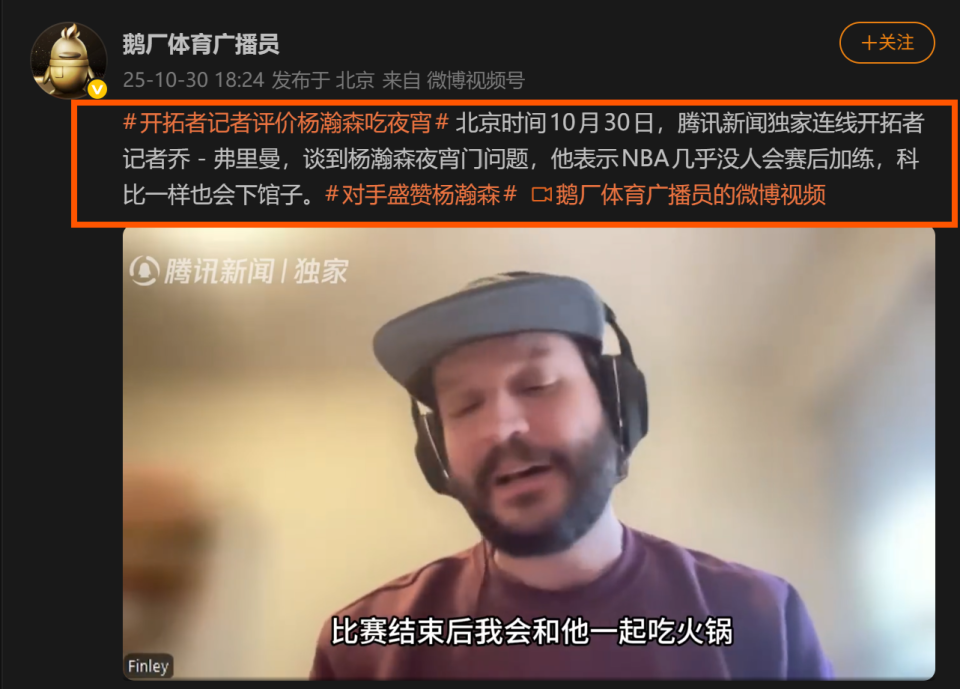 针对这场围绕“宵夜”的讨论,开拓者随队记者乔-弗里曼在接受采访时给出了不同的视角。他首先表示,那份食物看起来很美味,他甚至希望能知道餐厅地点,并与杨瀚森在赛后一同享用。弗里曼强调,在NBA的文化中,赛后外出用餐是“非常常见的”行为,他指出“几乎没有人在比赛后训练”。他解释了NBA紧凑的赛程,比如有时会达到四个晚上打3场比赛的强度,球员们在幕后付出了巨大努力,他们“确实需要休息”并且“确实需要吃东西”。为了佐证这一点,弗里曼回忆起大约10或15年前,他在洛杉矶报道时,曾亲眼目睹科比和他的队友在赛后深夜现身于一家热门餐厅。他总结道,联盟中的每个人都会这样做,粉丝们应当祝福他并关注其身体保护。