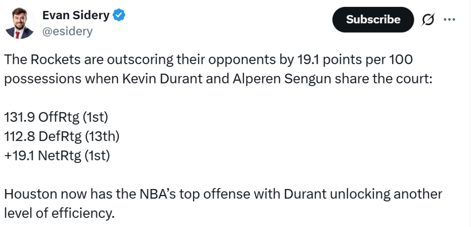 美记Evan Sidery也通过具体数据指出这一点,开赛至今,当杜兰特与申京同时在场时,火箭队进攻效率将进一步飙升至131.9断层高居第一。
