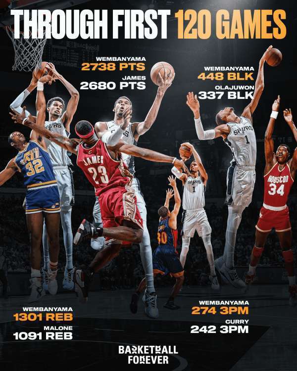4、生涯前120场比赛,文班亚马总得分超越同期詹姆斯,三分命中数超过库里,封盖数力压奥拉朱旺。