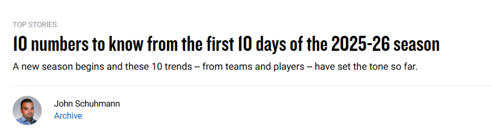 北京时间11月1日,2025-26赛季仍处于开局阶段,目前有4支球队保持不败,3支球队尚未取得首胜。尽管局势可能快速变化,但以下10组数据仍能清晰展现赛季前10天的关键趋势。所有数据统计截至北京时间10月31日。