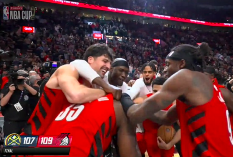 随着约基奇抛投不中,比赛就此结束,开拓者全队在场上开心的庆祝,全都围着格兰特,他是球队取胜功臣。替补席上的球员也纷纷来到球场当中,接着围在一起开心的庆祝着(里斯就冲上来与队友搂在一起),能够在主场击败强大对手掘金还是挺让人振奋的,同时在小组出线的机会上占据一个主动。