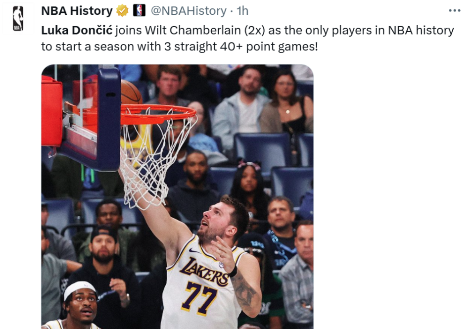凭借这样的表现,东契奇成为张伯伦后NBA历史上第二位能够在开季至少三场比赛中连续交出40+得分的球员,张伯伦曾在61-62赛季和62-63赛季连续两个赛季做到这一壮举。