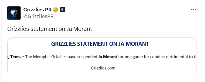灰熊官宣禁赛莫兰特一场!声称行为造成不利影响 薪金损失27万美元