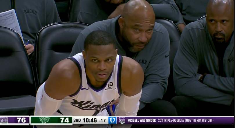 下半场,威少搭配德罗赞、施罗德、拉文和小萨首发出战,第三节国王38-31反超比分,威少在场上打得充满能量,冲抢篮板以及助攻队友,单节7次助攻串联全队;期间威少凶狠犯规引热议,当时字母哥快攻反击,威少暴力拉抱才拦住字母哥,裁判多角度回放这一幕,最终未升级判罚。