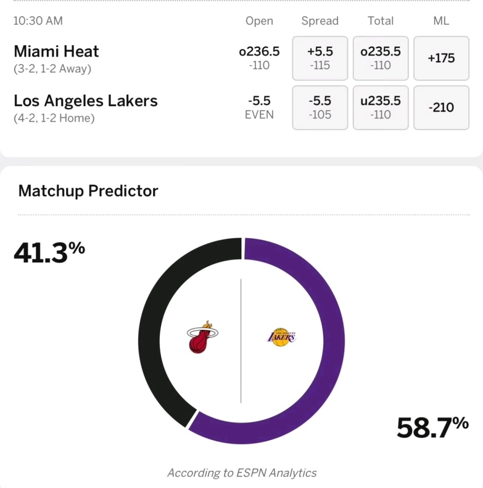 北京时间11月3日上午10点30分,洛杉矶湖人将在主场迎战迈阿密热火。这是湖人连续4个主场的第2战,也是他们冲击3连胜的绝佳机会。ESPN预测湖人胜率达到58.7%,但热火强悍的防守体系注定不会让比赛轻松。
