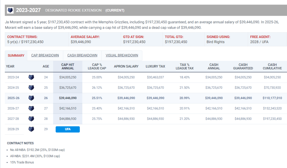 莫兰特五年1.97亿的顶薪合同仅仅执行到第三年,他本赛季的薪水高达3944万美元,下赛季4216万,27-28赛季4488万,目前森林狼的媒体对莫兰特很有意,模拟了两套交易方案。