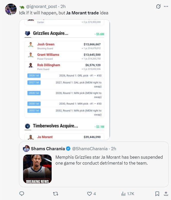 灰熊得到:约什-格林、格兰特-威廉姆斯、迪林厄姆、2026年魔术首轮、2027年独行侠首轮互换、2028年灰熊首轮互换、2030年森林狼首轮、2032年森林狼首轮互换;