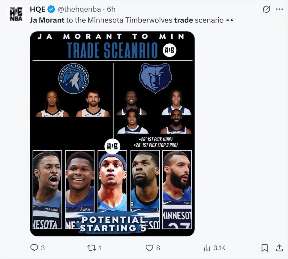 第一套,森林狼送出兰德尔、迪林厄姆、香农、康利、2026年不保护首轮、2028年前三保护首轮,从森林狼换来莫兰特、康查尔。这笔6换2的交易大家觉得如何?
