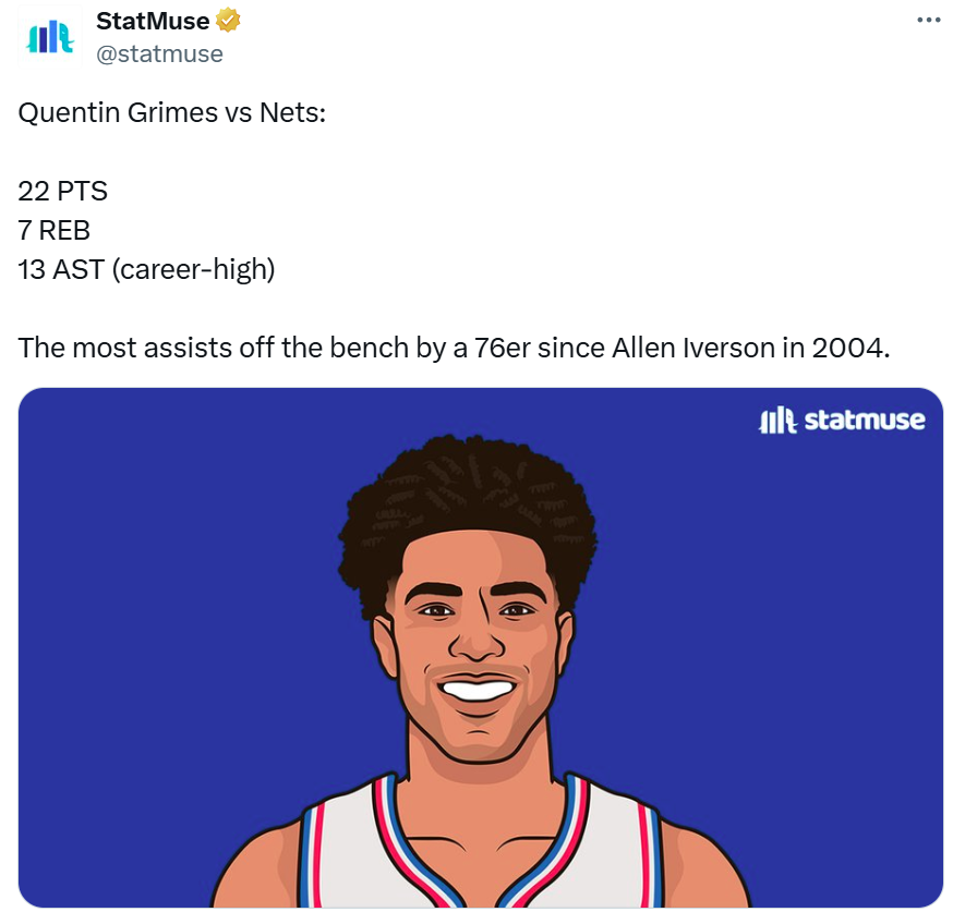 凭借这样的表现,格莱姆斯成为04年艾弗森后,76人队史首位以替补身份做到这点的球员。