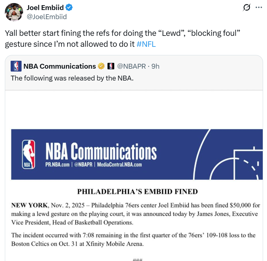 在缺席比赛的同时,恩比德还收到了一张5万美元的罚单,由于恩比德在前一场对阵凯尔特人队的比赛中做出不雅的庆祝动作NBA官方对其处以5万美元罚款。