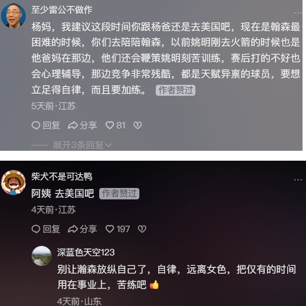 效仿姚明父母?疑似杨瀚森妈妈连续点赞“去美国陪儿子”言论