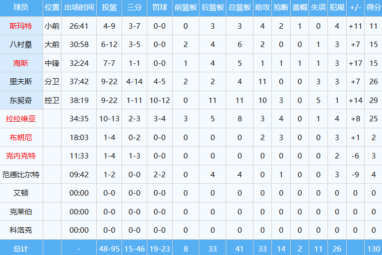东契奇贡献29分11板10助三双,里夫斯26分11助两双到手,拉拉维亚25分进账,合计80分。