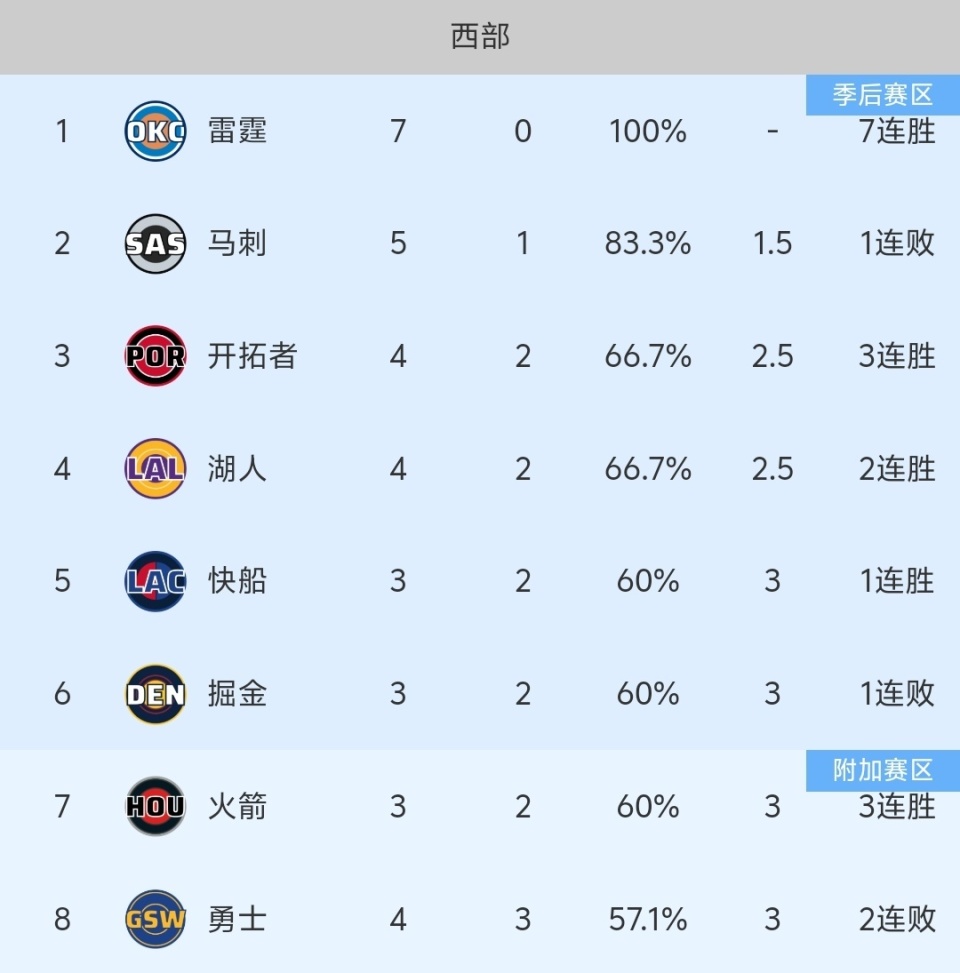 随着马刺118-130输球,雷霆豪取7连胜,NBA积分榜更新:火箭第7!