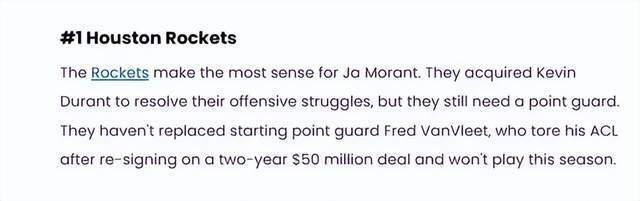 根据美媒《Sportskeeda》的最新报道表示,火箭是目前最有可能接盘莫兰特的下家,甚至还列出了详细的七换一大交易方案: