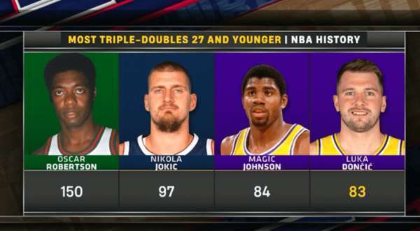 28岁前三双次数:东契奇以26岁之龄达成83次三双,在NBA历史28岁前三双榜上排名第四,仅次于奥斯卡·罗伯特森(150次)、约基奇(97次)和魔术师约翰逊(84次)。