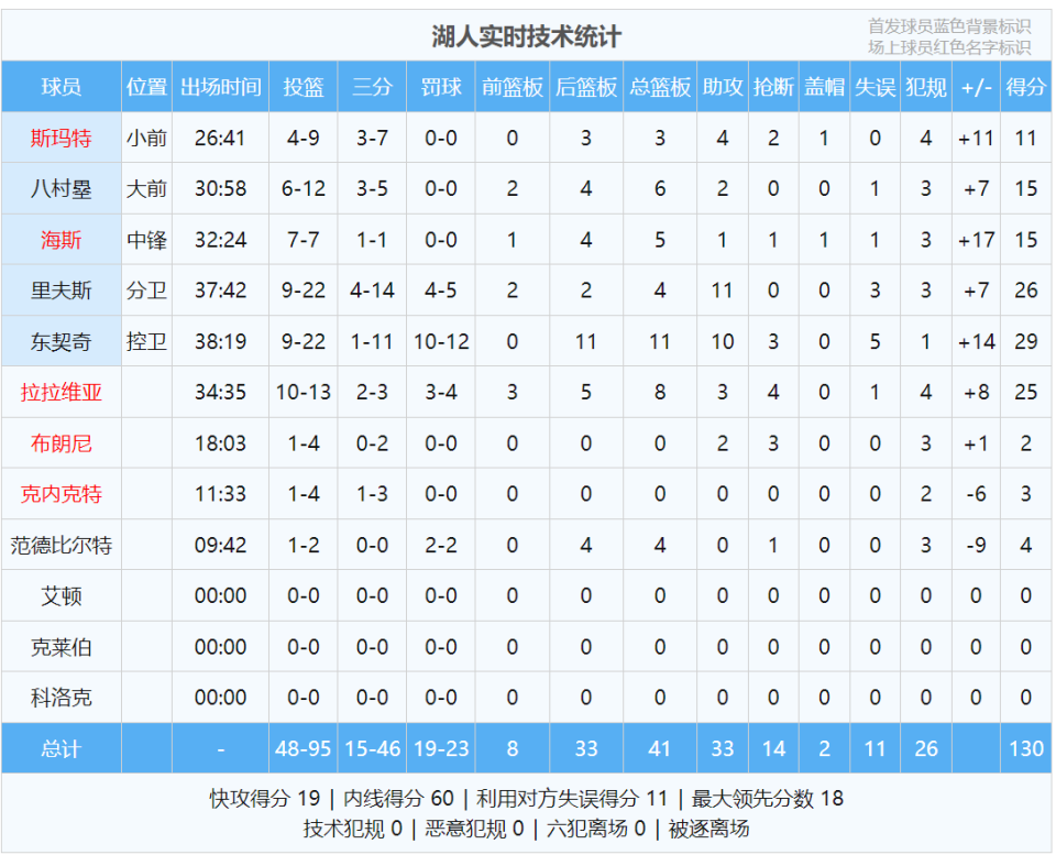 此役过后,湖人5胜2负升至西部第三。最后看看数据,说说你的心情: