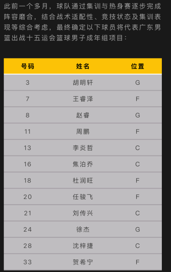 媒体人赵探长透露广东全运会男篮的12人名单已经确定,由赵睿、胡明轩领衔,12名球员都有国手或进入国家队集训的经历。