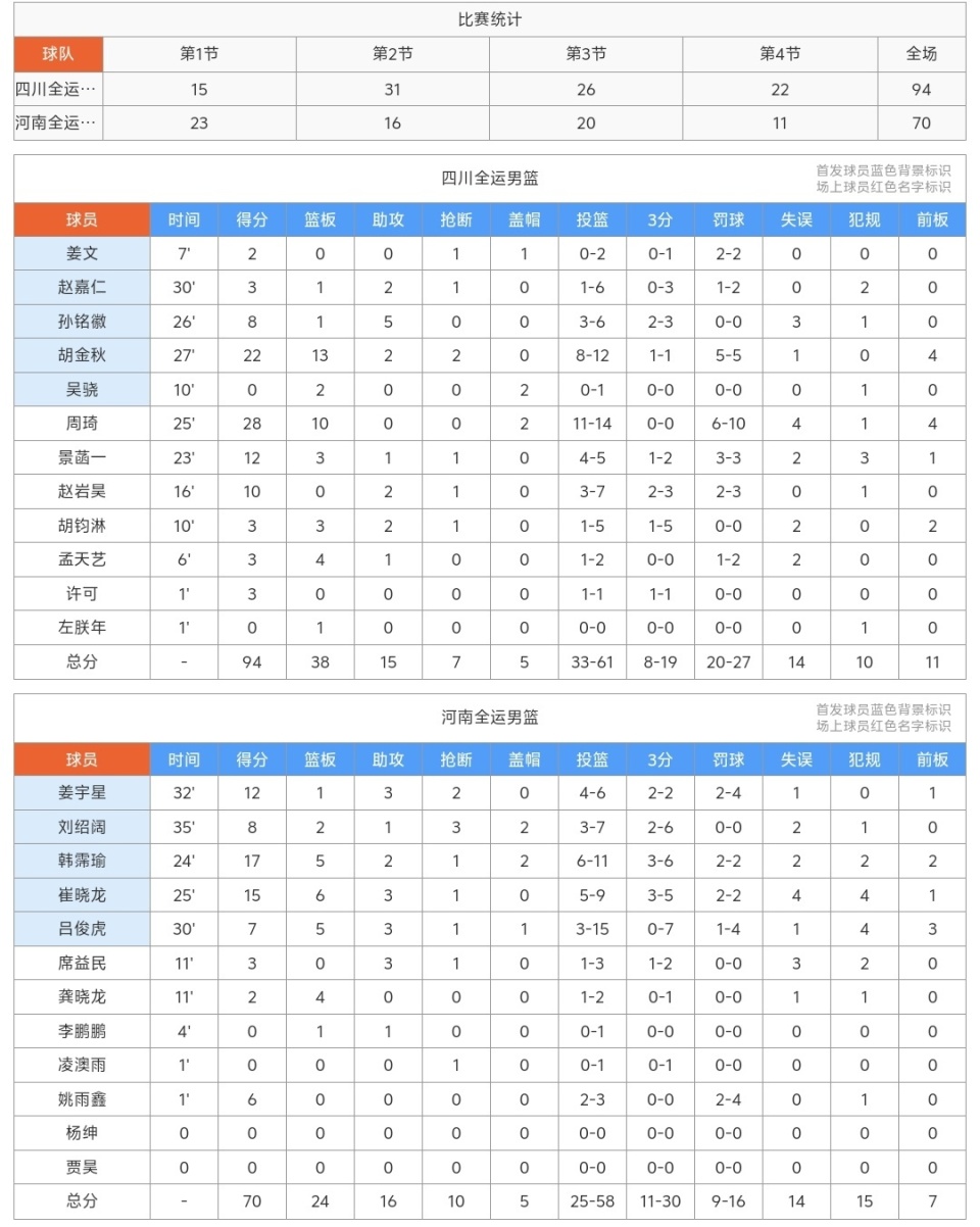 全运会:周琦爆砍28+10,带队94-70胜河南,四川两连胜+小组第一!