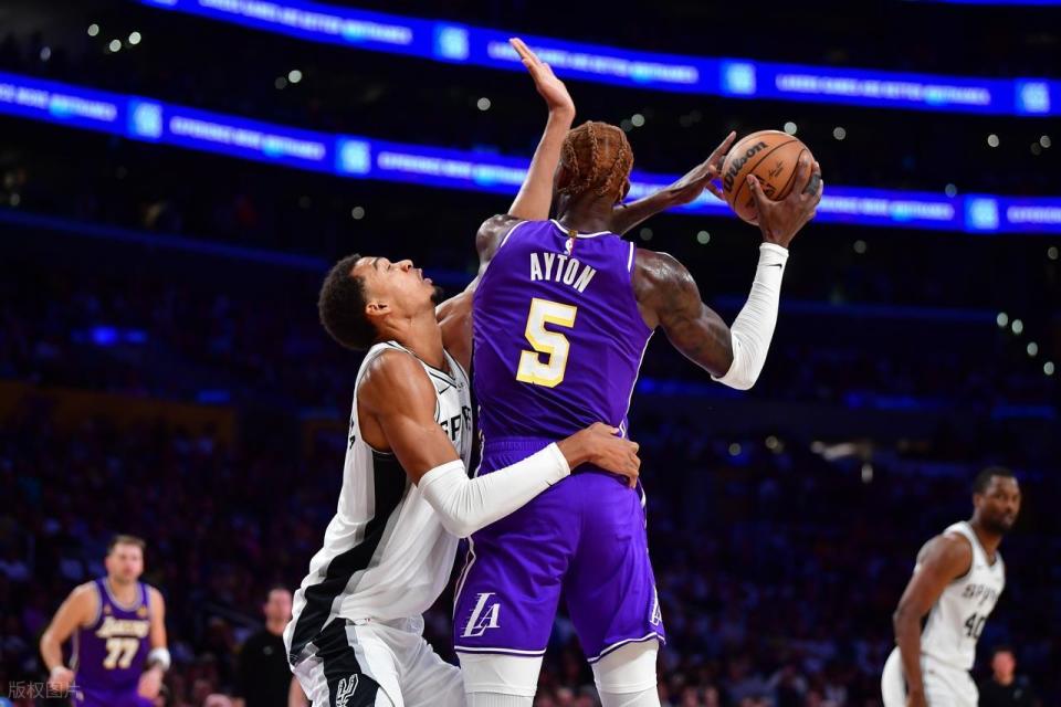 末节初段,拉拉维亚中投先进,文班被斯玛特造第5犯被换下,沃特斯三分命中,东契奇助攻给海斯空接2+1!此后双方比分交替上升,艾顿篮下抛投打进追到97-103,马刺喊停。暂停以后,索汉命中三分,东契奇造犯规罚球,艾顿大帽以后,东契奇反击给到八村三分再中,湖人追到只差2分。马刺又一个暂停,然后双方争夺白热化,斯玛特前场篮板拿下来打进追平,文班亚马立马还以颜色。东契奇大心脏三分反超,文班亚马6犯毕业,马刺挑战失败。艾顿两罚两中以后,湖人挑战出界成功,八村罚球领先到了4分,马刺抢攻以后犯规战术,但连续三分不进。斯玛特最后时刻发球踩线失误,给马刺0.4秒。尚帕尼空接被犯规,但两罚不中,凯尔登压哨补篮也没有,遗憾输球。