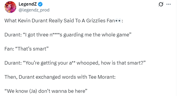 原声曝光!杜兰特爆粗回击球迷 狂喷莫兰特父亲:你儿子不想待在灰熊