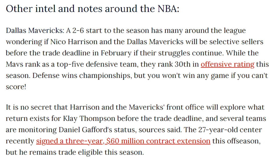 北京时间11月8日凌晨,据ClutchPoints记者Brett Siegel报道,哈里森和独行侠管理层,将探索交易克莱-汤普森。其他球队对加福德更感兴趣,正在密切关注加福德的情况。今天上午9点,独行侠客场挑战灰熊,目前独行侠西部垫底。