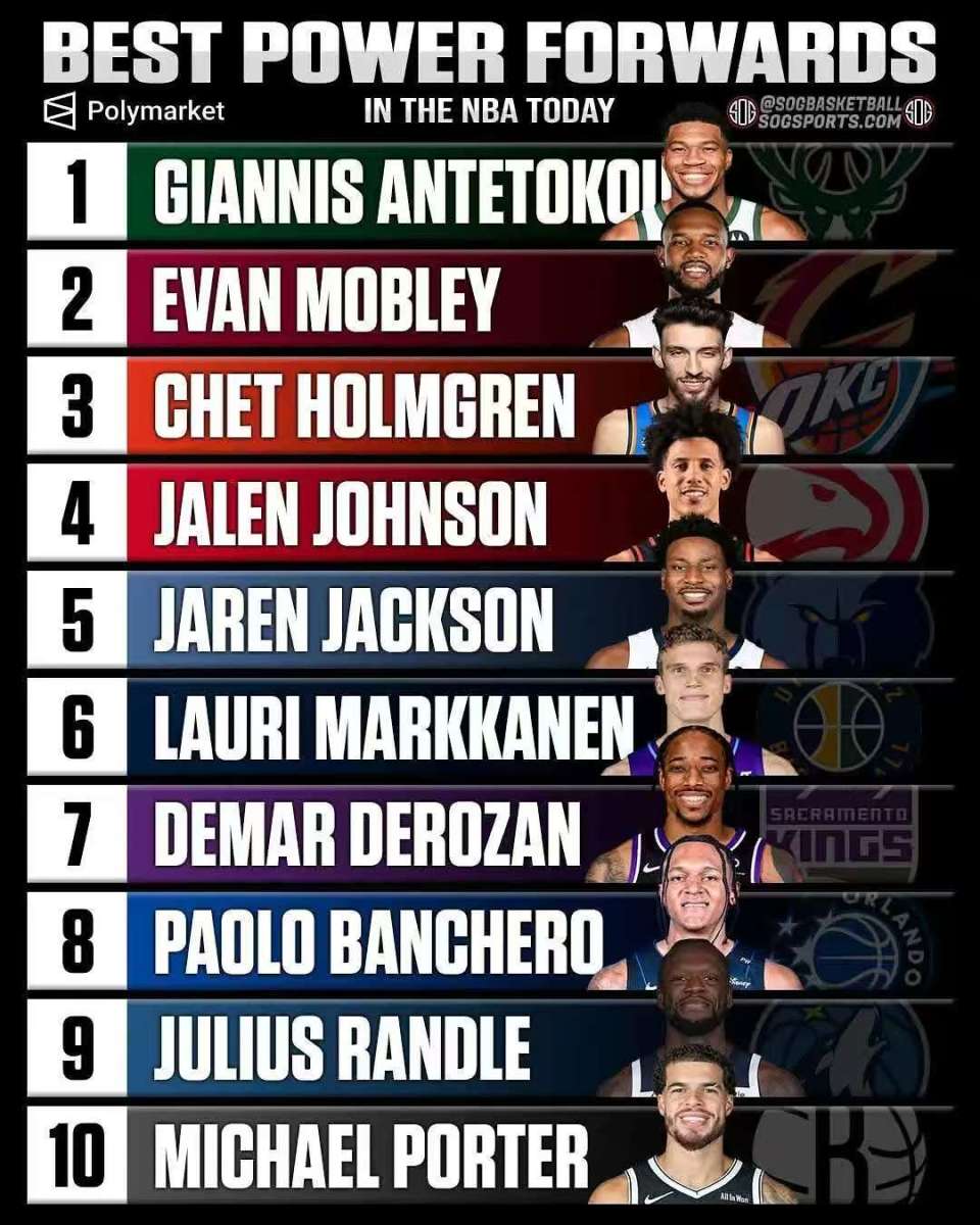大前锋前十依次是:1字母哥、2莫布里、3切特、4杰伦约翰逊、5贾伦杰克逊、6马尔卡宁、7德罗赞、8班切罗、9兰德尔、10小波特。字母排在第一毋庸置疑的,本赛季的字母打出了生涯最佳表现,毕竟是单核带队,想要冲击好成绩,必须火力全开了。莫布里是现役防守最好的大前锋之一,上赛季拿下了联盟最佳防守球员。