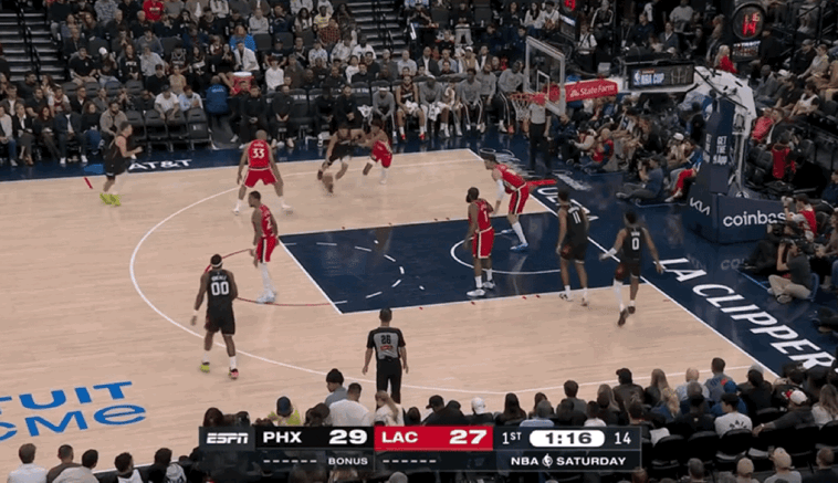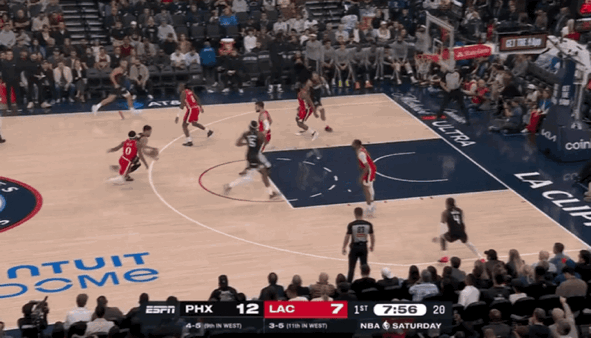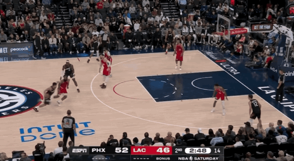 次节比赛,快船连得6分缩小分差,古德温和吉莱斯皮连续三分命中及时止损,布克在本节还剩下7分14秒回归,快船凭借着内线优势连得7分反超比分。