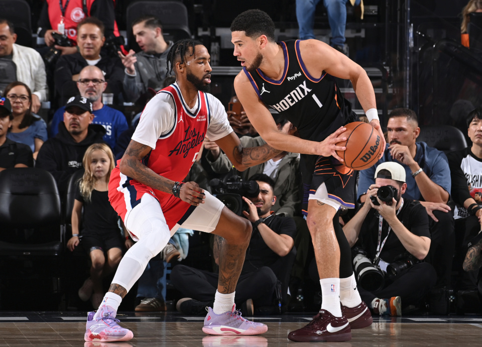 太阳在末节比赛成功稳住局势,重新建立双位数领先,但快船还是顽强地试图追分,布克在最后7分41秒回归,两队一度展开三分互飙。快船将防守重心全部放在布克身上,布克在圈顶持球想要启动时,快船球员就会对他采取包夹,不给他轻易串联起整支队伍的机会。
