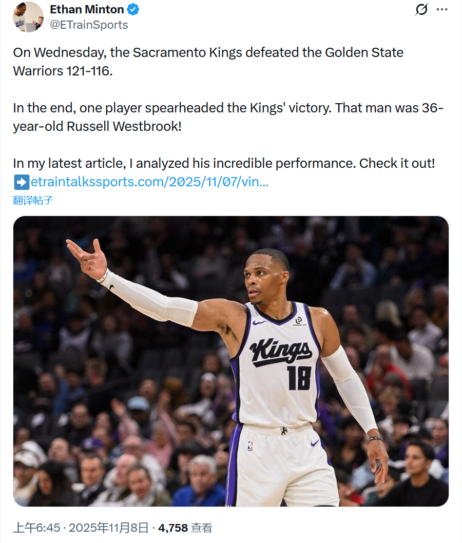 国王队记Ethan Minton则写道:“威少表现惊人,打出全明星级别的篮球。他尽全力提升国队的表现,但国王队友们的轮换和输出不佳,拖累了球队的前进。”