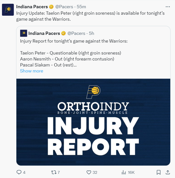 步行者这边更惨9人缺席,阿隆-内史密斯因右前臂挫伤缺阵,西亚卡姆因轮休不会出场。弗菲左脚踝扭伤、昆顿-杰克逊右腿筋拉伤、马瑟林右脚大拇趾扭伤、卡姆-琼斯出现下背部应力反应、麦康奈尔左腿筋拉伤、奥比-托平右脚应力性骨折,哈利伯顿右跟腱撕裂缺阵。