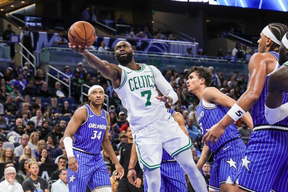 凯尔特人力克魔术,杰伦-布朗上半场投篮11中5,罚球2中2,得到12分1篮板1助攻。