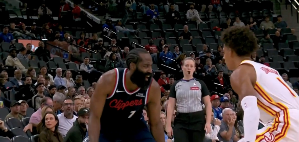 末节进入最后1分钟,哈登突破的过程中和波尔津吉斯对抗后倒地,老鹰提出挑战,裁判认定波尔津吉斯绊倒了哈登,登哥两罚全中,快船依旧落后4分。