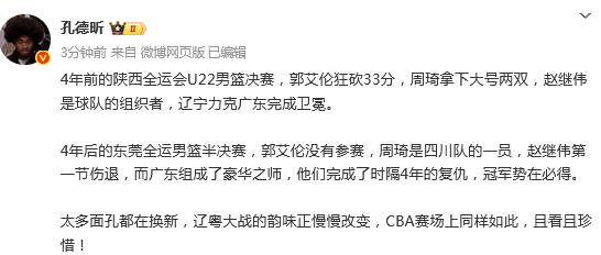 体坛周报记者“孔德昕”发文点评“4年前的陕西全运会U22男篮决赛,郭艾伦狂砍33分,周琦拿下大号两双,赵继伟是球队的组织者,辽宁力克广东完成卫冕。