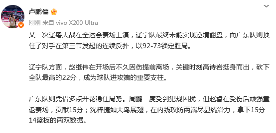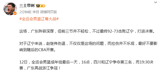 媒体人“三土带刺”发文点评:“这场,广东阵容深厚,但前三节并不轻松,不过最终92-73击败辽宁,打进决赛。