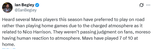 美记Ian Begley则报道称,因为与尼科-哈里森有关的紧张氛围,本赛季有多名独行侠球员更倾向于打客场而不是主场。球员们并不是对球迷有所指责,而是对这种氛围产生了自然反应,独行侠最近10场比赛中有7场是在主场进行的。