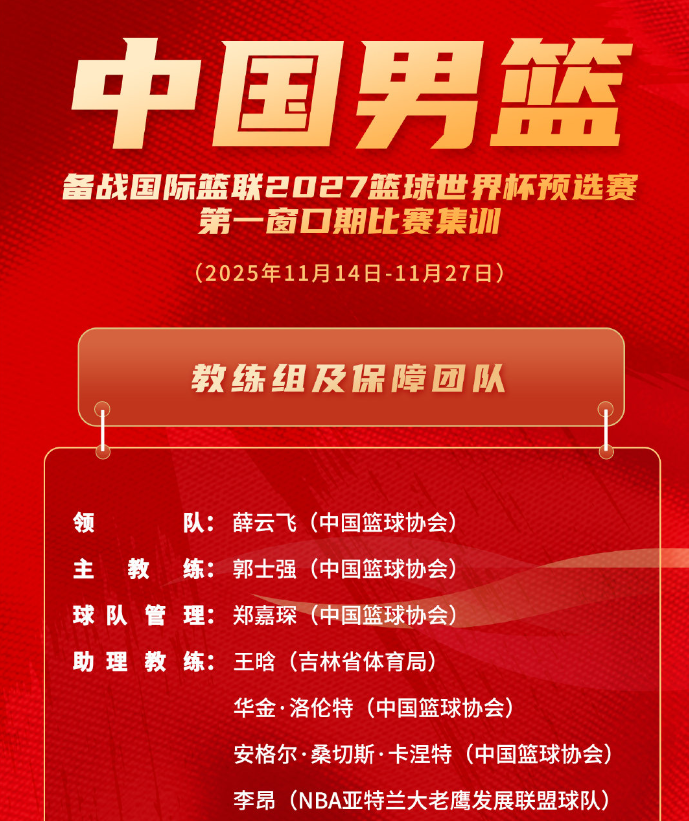 中国男篮本次集训的目的就是为了参加2027年男篮世界杯窗口期的比赛。11月28日,中国男篮将在主场北京迎战韩国队。12月1日,中国队将在客场再次和韩国队交手。