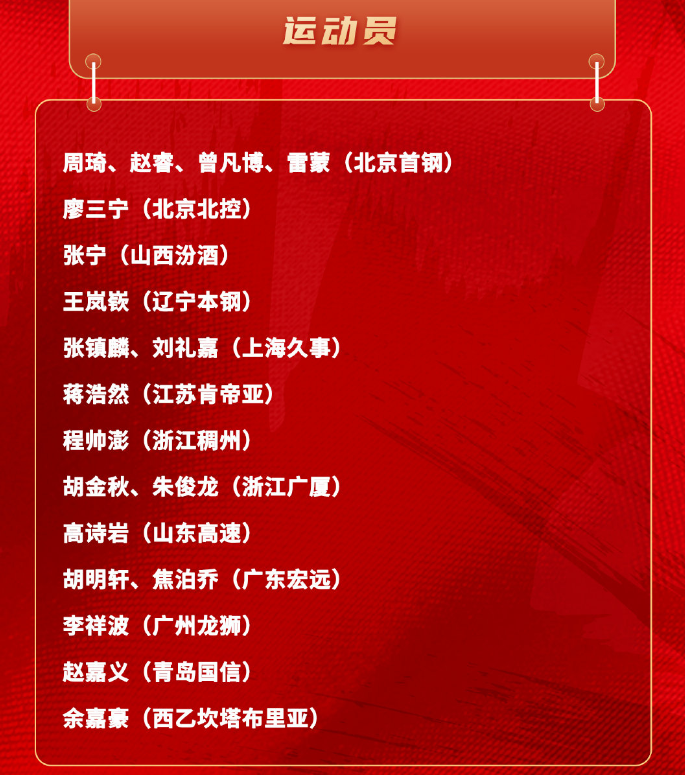 这19名球员分别是:周琦、赵睿、曾凡博、雷蒙(北京)、廖三宁(北控)、张宁(山西)、王岚嵚(辽宁)、张镇麟、刘礼嘉(上海)、蒋浩然(江苏)、程帅澎(浙江)、胡金秋、朱俊龙(广厦)、高诗岩(山东)、胡明轩、焦泊乔(广东)、李祥波(广州)、赵嘉义(青岛)、余嘉豪(西乙坎塔布里亚)。