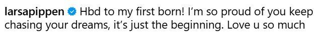 拉尔萨-皮蓬写道:“祝我的大儿子生日快乐!我非常自豪你一直在追逐自己的梦想,这只是一个开始,非常爱你”。