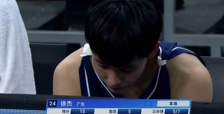 第二节中段,先前4中0的胡明轩终于投进打板三分有所贡献,杜锋趁热打铁换上刘传兴,丁伟也换上有伤在身走路一瘸一拐的程帅澎(这是招败笔),接下来广东队进攻全面复苏,大刘上来就有贡献制造2+1,贺希宁也成功打出转换,4分30秒徐杰再中三分,广东队一波11-1领先来到40-28。