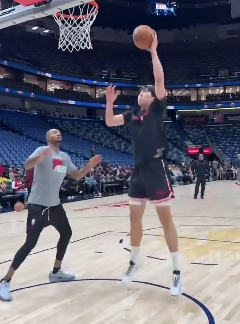 赛前开拓者官方又晒出杨瀚森在鹈鹕主场训练的视频。