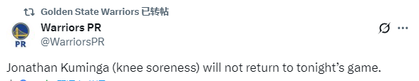 勇士官方宣布,库明加因膝盖酸痛退出本场比赛,伤退前,库明加替补出战12分钟,1投0中拿到0分4篮板1失误,正负值-10