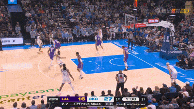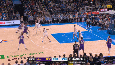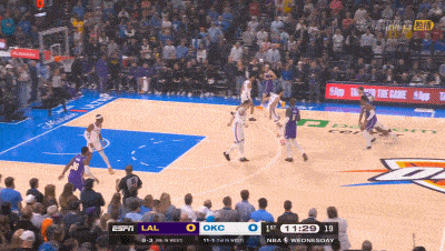 北京时间11月13日,NBA常规赛继续进行。在今天一场焦点之战中,雷霆队主场迎来湖人队的挑战。湖人队开场连连打铁,单节仅得到18分落后雷霆队12分。次节比赛开始后,雷霆队多点开花单节轰出40-20,湖人队第三节依然无力缩小分差,双方分差拉开到30分以上。雷霆队主力三节打卡,湖人队末节初段短暂抵抗之后放弃,最终雷霆队以121-92大胜湖人队。雷霆队取得四连胜,战绩变成12胜1负;湖人队战绩变成8胜4负。